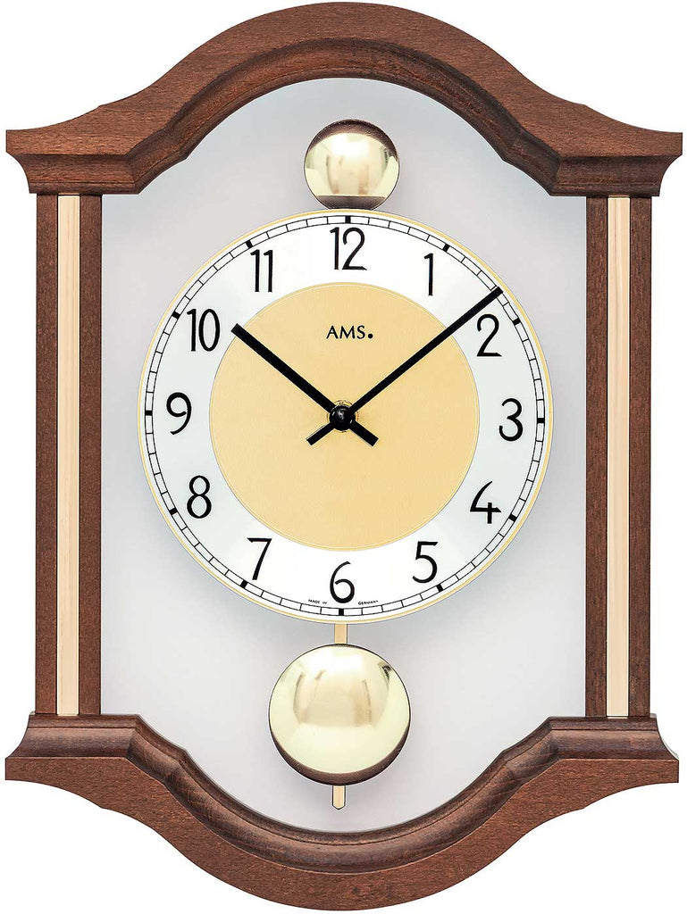 AMS Wanduhr 34x26x6 cm Nussbaum • Geräuschloses Quarzwerk • Elegantes Doppelpendel