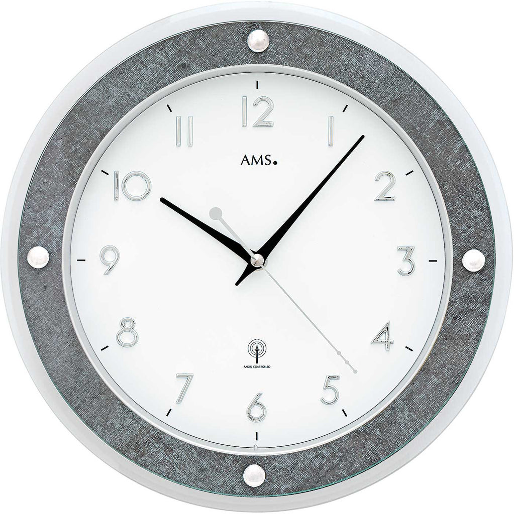 Ausgestattet mit einem präzisen Funkuhrwerk, stellt sich die AMS 5566 automatisch auf die exakte Uhrzeit ein – ganz ohne Nachjustieren. Die analoge Anzeige mit schwarzem Stunden- und Minutenzeiger sowie einem grauen Sekundenzeiger ist auf dem weißen Zifferblatt besonders gut ablesbar. Aufgelegte, silberfarbene arabische Ziffern und das bedruckte graue Glas unterstreichen das moderne Design dieser praktischen Funkwanduhr.