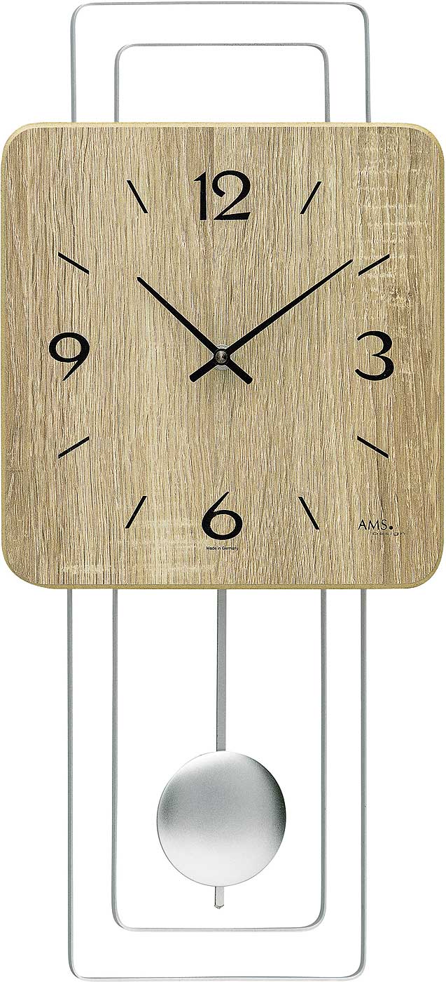 AMS 7502 bringt ein modernes Design in die Räumlichkeiten. Das schwingende Pendel erinnert an vergangene Zeiten. Diese Uhr hat eine freiligende Metallrückwand und ein Holzgehäuse. Das Zifferblatt besteht aus Sonomaeiche