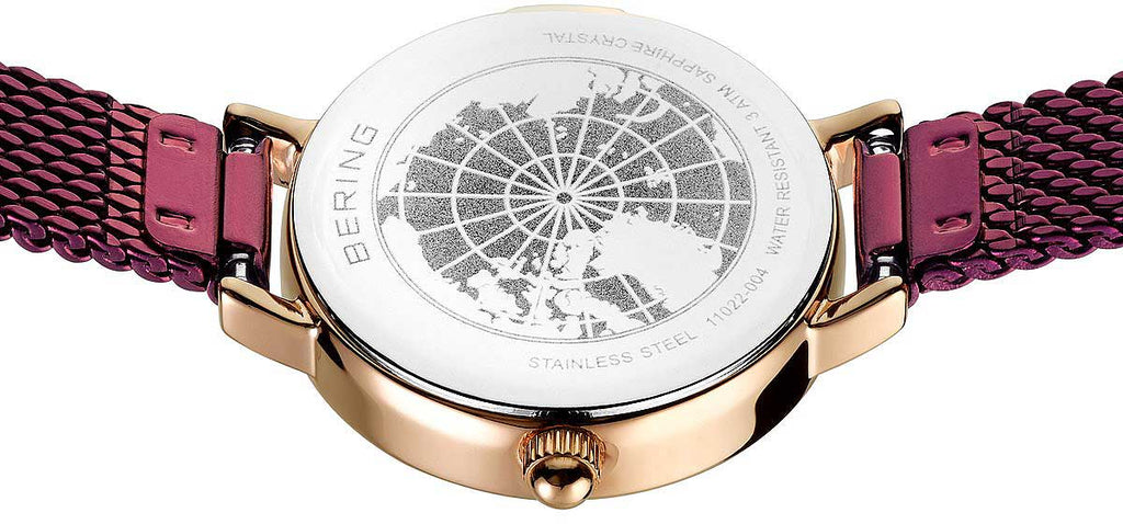 Die Bering Damenuhr 11022-969 aus der Classic Collection kombiniert dezentes Design mit hochwertigen Materialien. Das roségoldfarbene Edelstahlgehäuse mit einem Durchmesser von 22 mm und einer Höhe von 6 mm wird von einem kratzfesten, flachen Saphirglas geschützt. Das lilafarbene Zifferblatt mit roségoldfarbenem Strichindex wird von drei Zeigern für Stunde, Minute und Sekunde ergänzt. Ein lilafarbenes Edelstahl-Milanaiseband sorgt für einen stimmigen Gesamteindruck und hohen Tragekomfort.