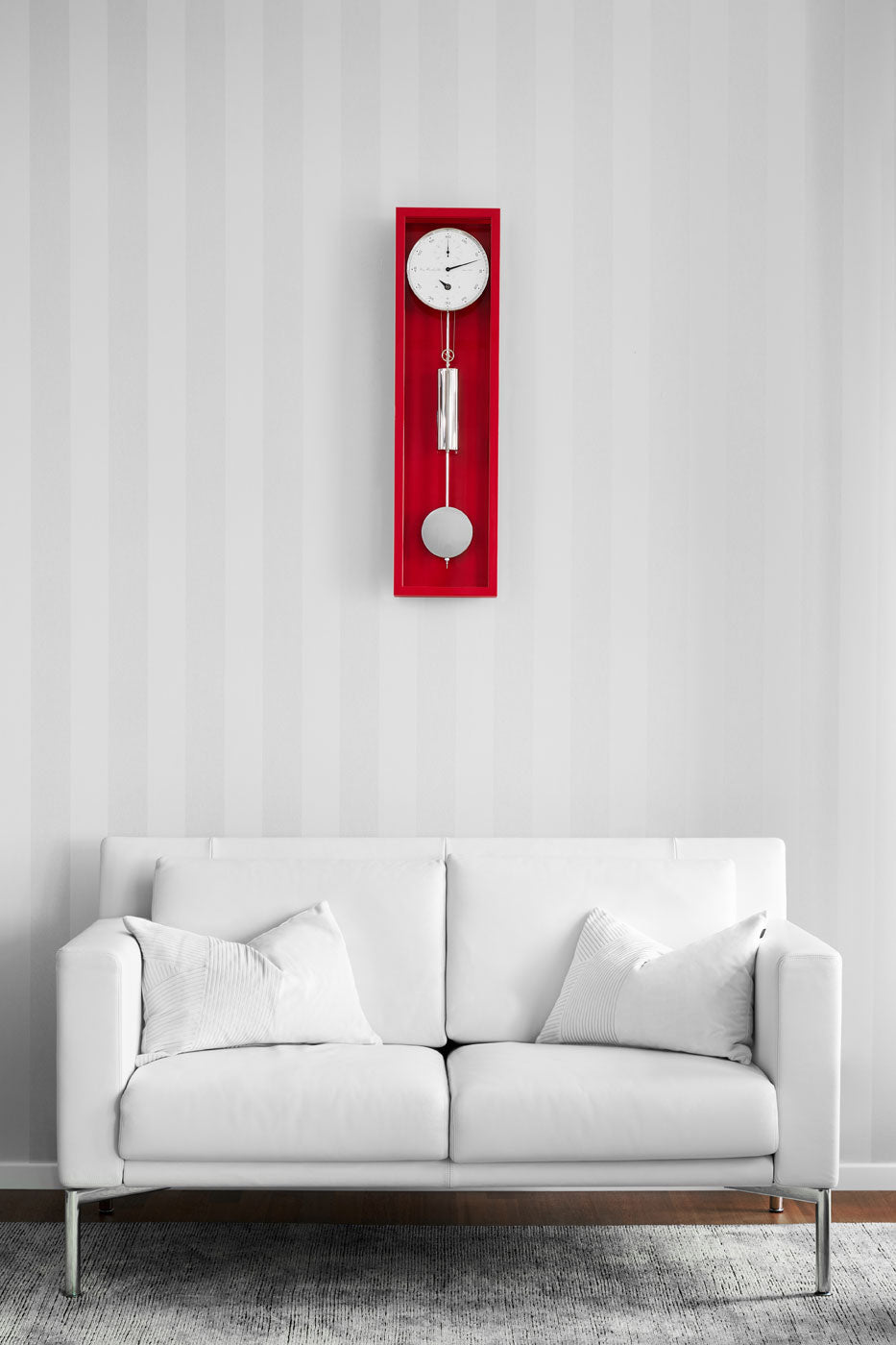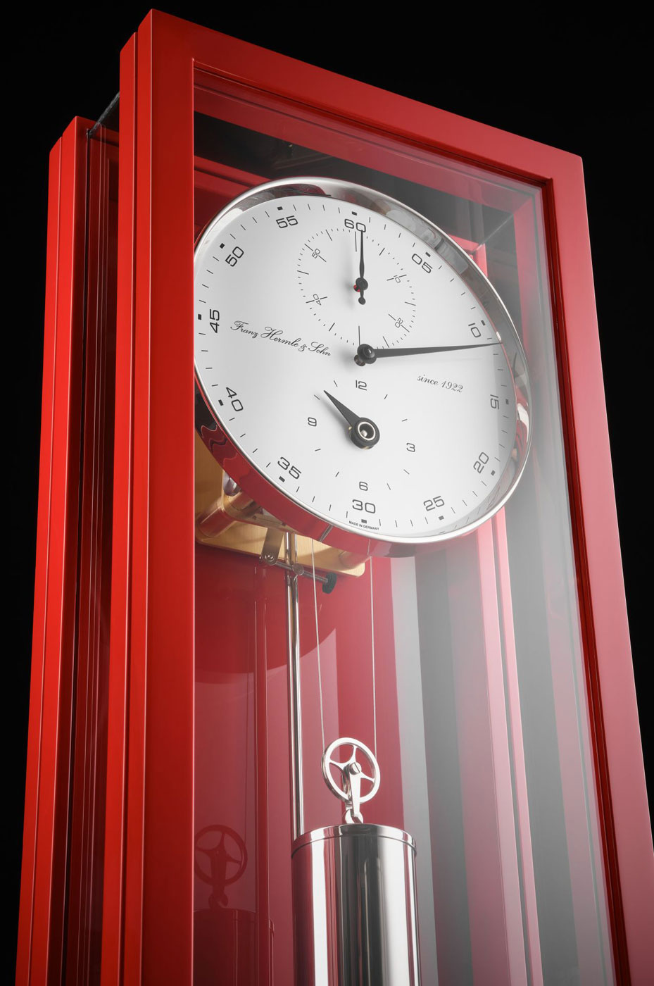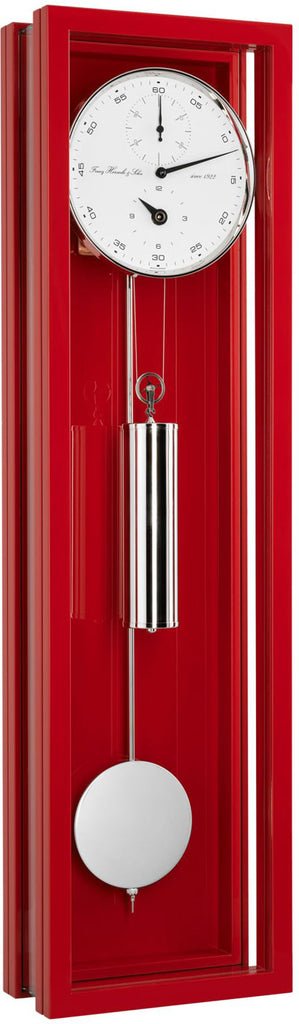 Die Hermle Wanduhr 71006-360761 verkörpert die perfekte Symbiose aus modernem Design und präziser Uhrmacherkunst. Ihr schlankes Gehäuse aus hochwertigem Massivholz mit einer eleganten roten Lackierung und die vollflächige Verglasung bieten einen faszinierenden Einblick in das filigrane mechanische Uhrwerk.