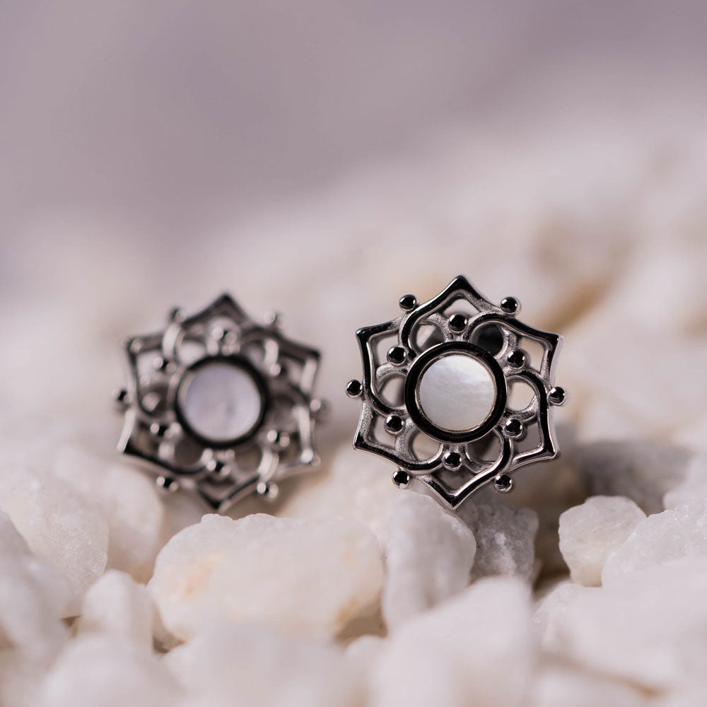 Die Damen Ohrringe mit Perlmutt in Blütenform vereinen zarte Eleganz mit hochwertiger Verarbeitung. Gefertigt aus robustem 316L Edelstahl und mit einer edlen Platinplattierung veredelt, überzeugen die Ohrringe durch ihre stilvolle Silberoptik und ihre besondere Haltbarkeit. Das weiß schimmernde Perlmutt im Zentrum der Blüten verleiht den Ohrsteckern einen sanften Glanz, der sich harmonisch mit dem glänzenden Metall ergänzt.