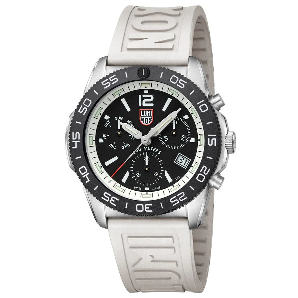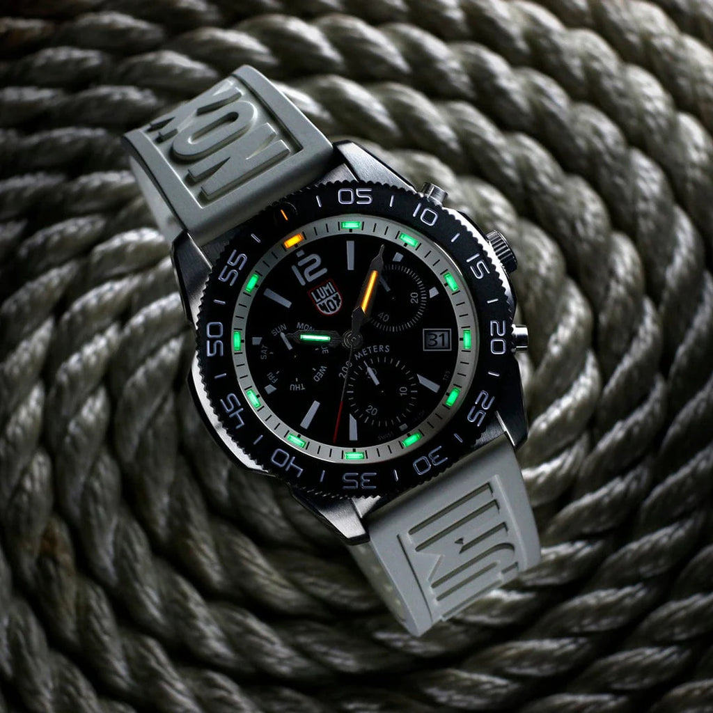 Erleben Sie unübertroffene Ablesbarkeit bei allen Lichtverhältnissen dank der einzigartigen Luminox Light Technology (LLT), die bis zu 25 Jahre lang selbstständig leuchtet. Die Pacific Diver XS.3141 wurde für den militärischen Einsatz entwickelt und ist eine zuverlässige Taucheruhr mit 20 Bar Wasserdichtigkeit.