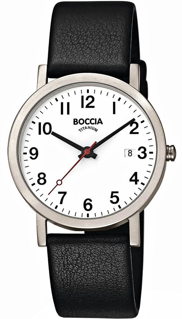 Die Boccia 3622-03 setzt auf leichtes Titan und eine klare, sachliche Formsprache. Das matte, runde Gehäuse misst 38 mm in der Breite und bleibt mit rund 8 mm flach genug für die Manschette. Eine feststehende, schlanke Lünette und der geschlossene Titanboden unterstreichen den reduzierten Charakter, während das geringe Gewicht für hohen Tragekomfort sorgt – hautfreundlich und unaufdringlich im Alltag.