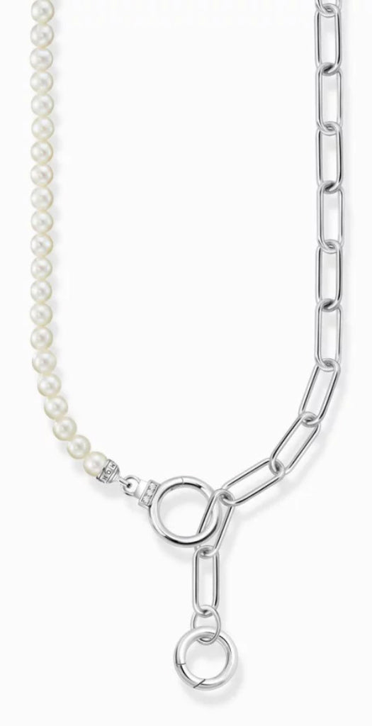 Entdecken Sie dieses elegante Collier, das einen zeitlosen Kontrast zwischen klassischer Eleganz und modernem Design schafft. Das Schmuckstück ist aus hochwertigem, recyceltem 925 Sterling Silber gefertigt und besticht durch die stilvolle Kombination aus schimmernden Süßwasserzuchtperlen und einer polierten Gliederkette.